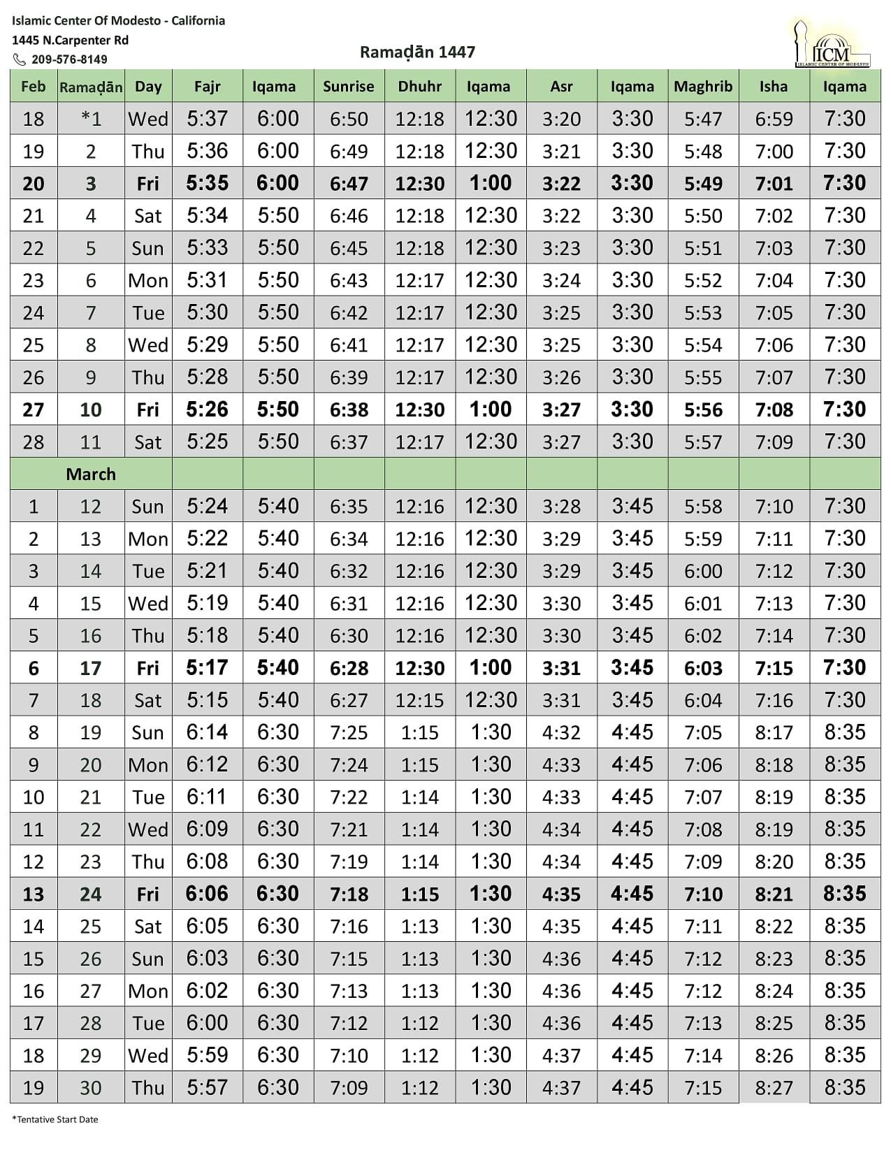 Prayer Schedule